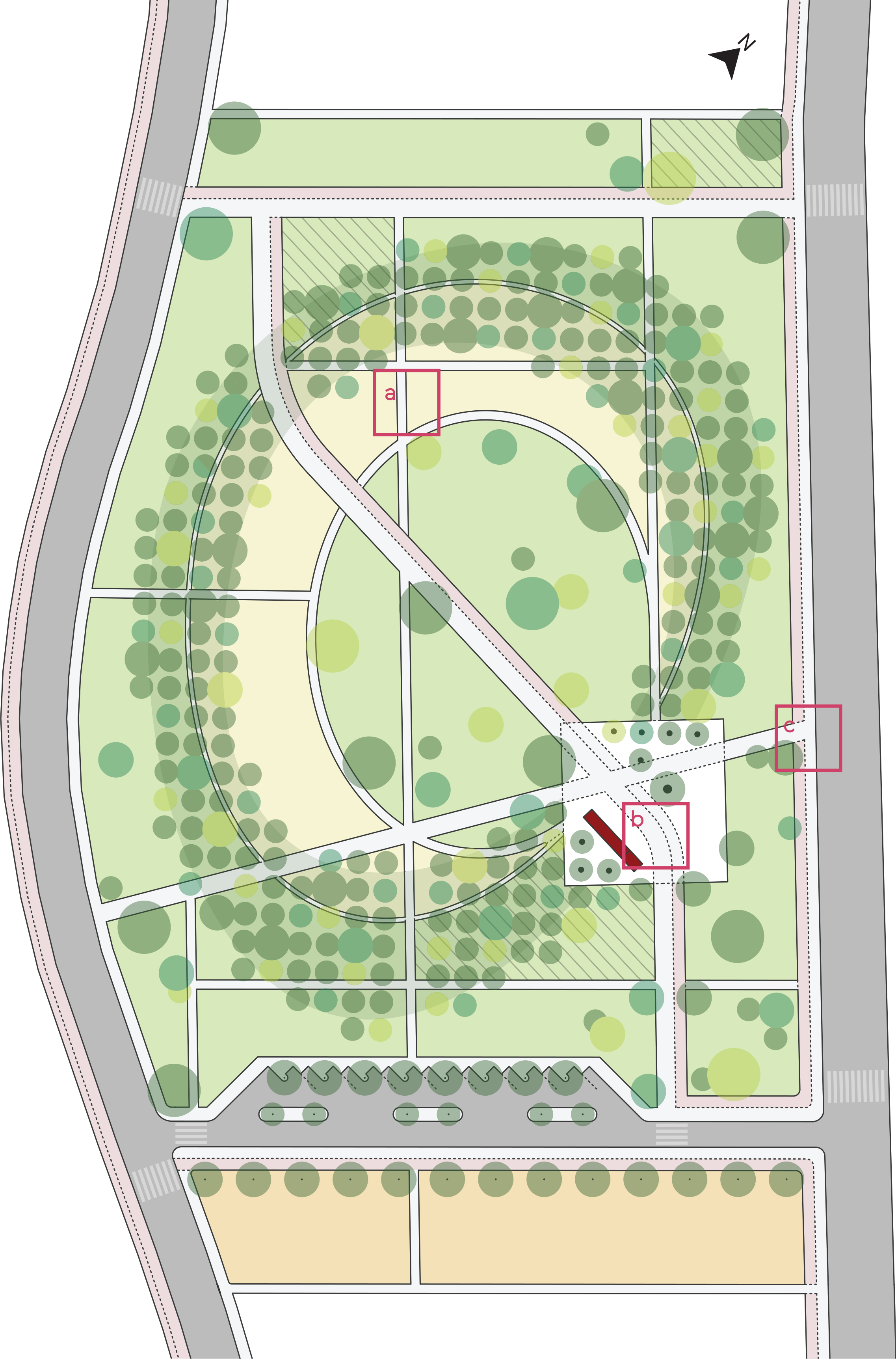 Viali, strade, siepi, filari e giardini hanno come protagonista la vegetazione, che segue le geometrie e le forme del costruito. In questo reticolo sono proprio i nodi, a generare l’orientamento nello spazio geometricamente determinato; la geometria anulare al centro, focalizza e al contempo mette in pausa il ritmo, ridistribuisce i flussi e determina un evento che diventa lo spazio pubblico per eccellenza.