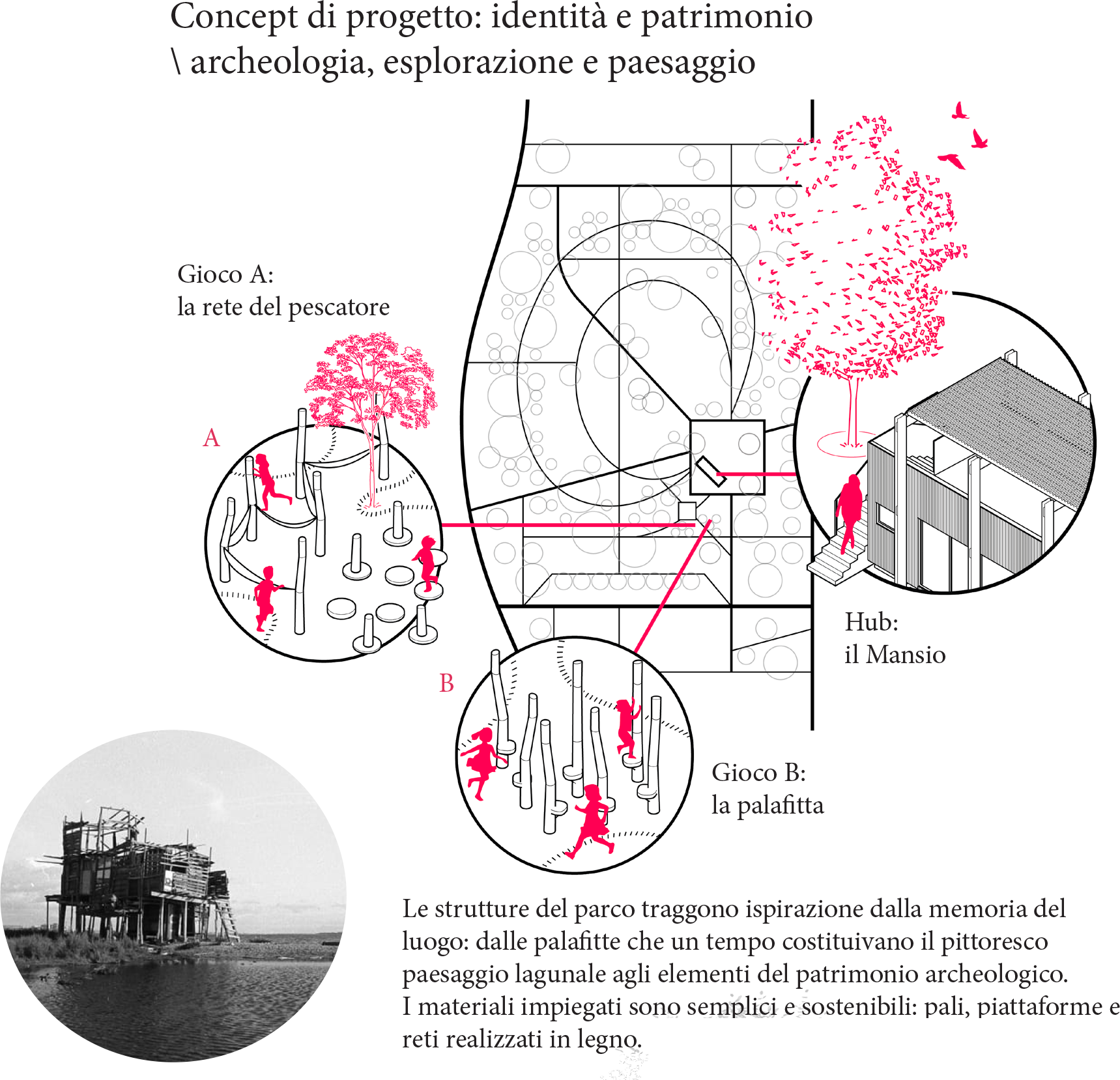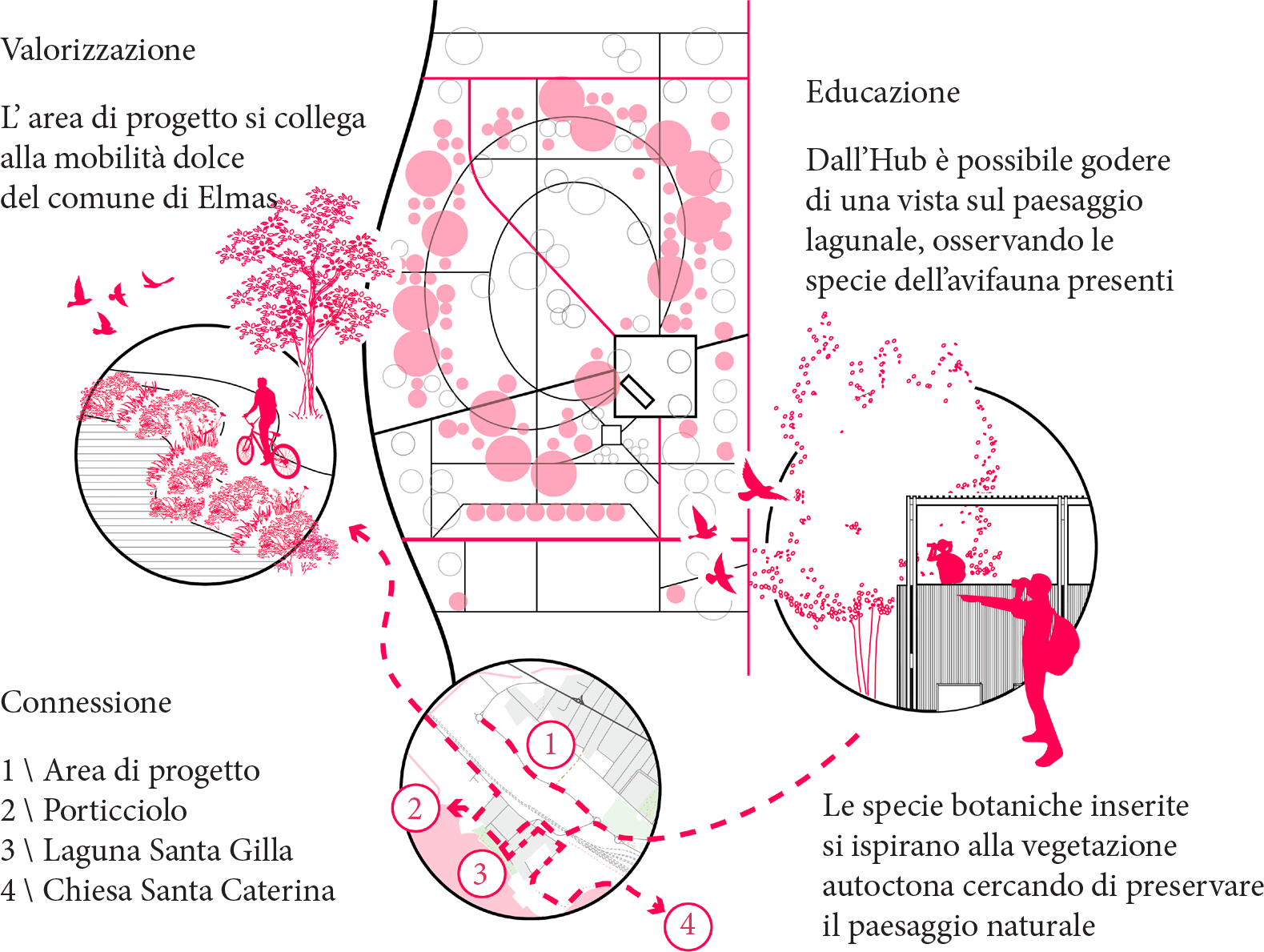 Il paesaggio dell’acqua, i campi agricoli, il tessuto urbano esistente, sfumano e si uniscono in un luogo di interconnessione dalla forma anulare, quasi ellittica, figura dinamica dell’incontro.
